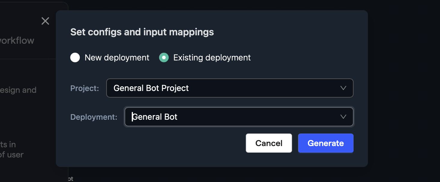 If you have an existing Agent Node you would like to add, or you have a custom ChatBot you have previously deployed that you would like to incorporate, selecting Existing will allow you to select the specific project and deployment: