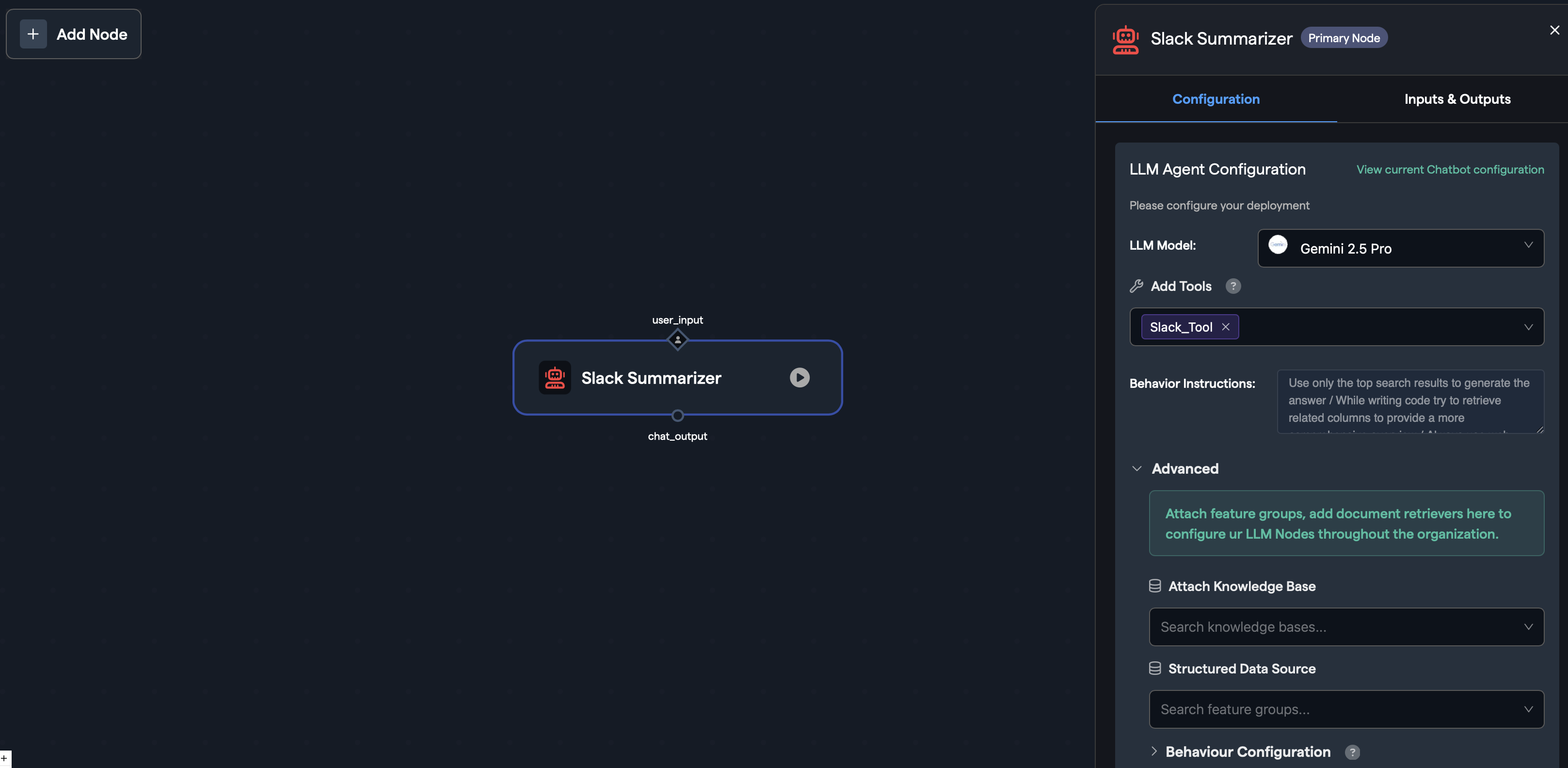 A new feature of the workflows are the LLM Agent Nodes which incorporate the power of the Abacus platform to handle common agent tasks like tool integration and data processing without having to build them each time. In the workflow builder select Add Node and then LLM Agent Node from the options: