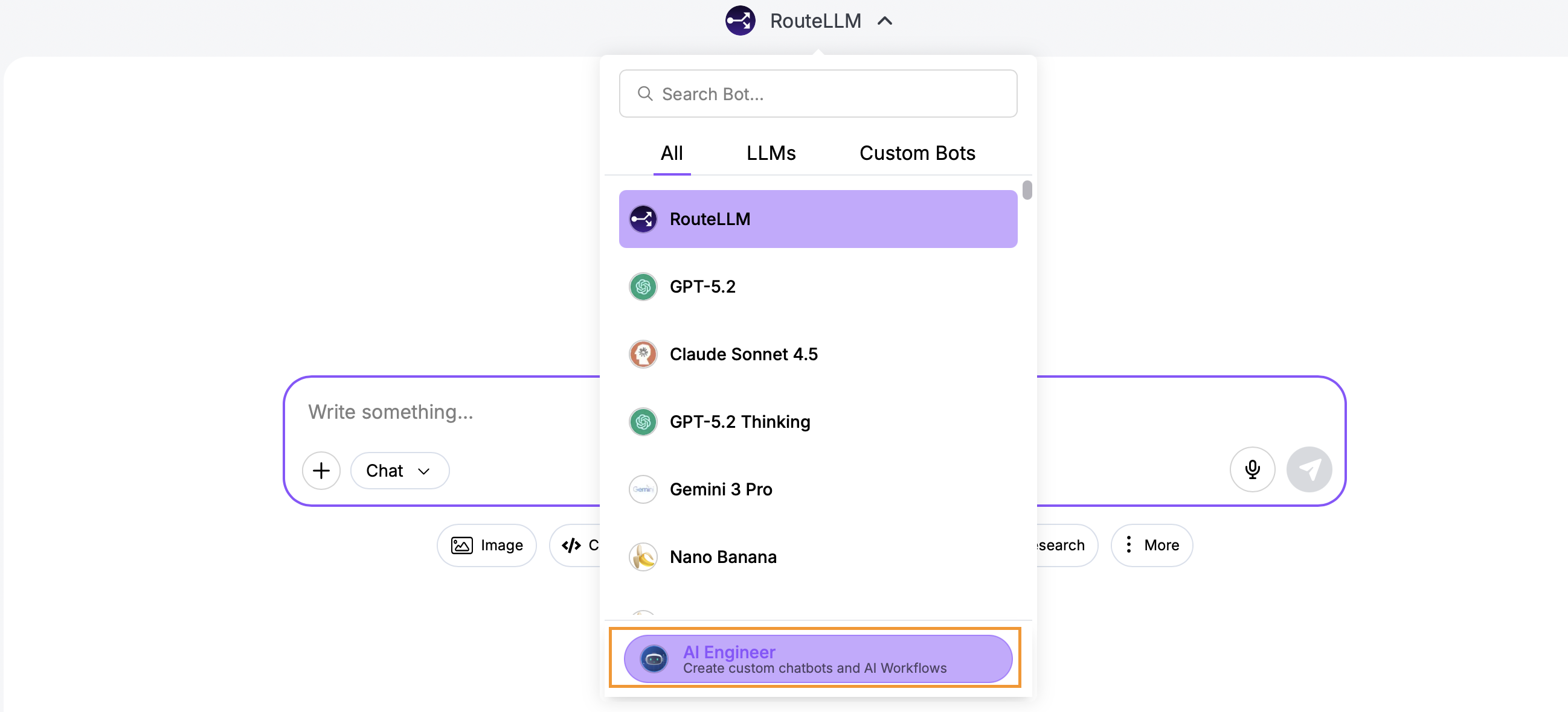 DeepAgent Workflow Builder A number of updates have also been made to how Abacus can autonomously build workflows using the DeepAgent. In order to access this functionality navigate to the Abacus front-end UI and under the LLM dropdown at the top of the page, select the AI Engineer: