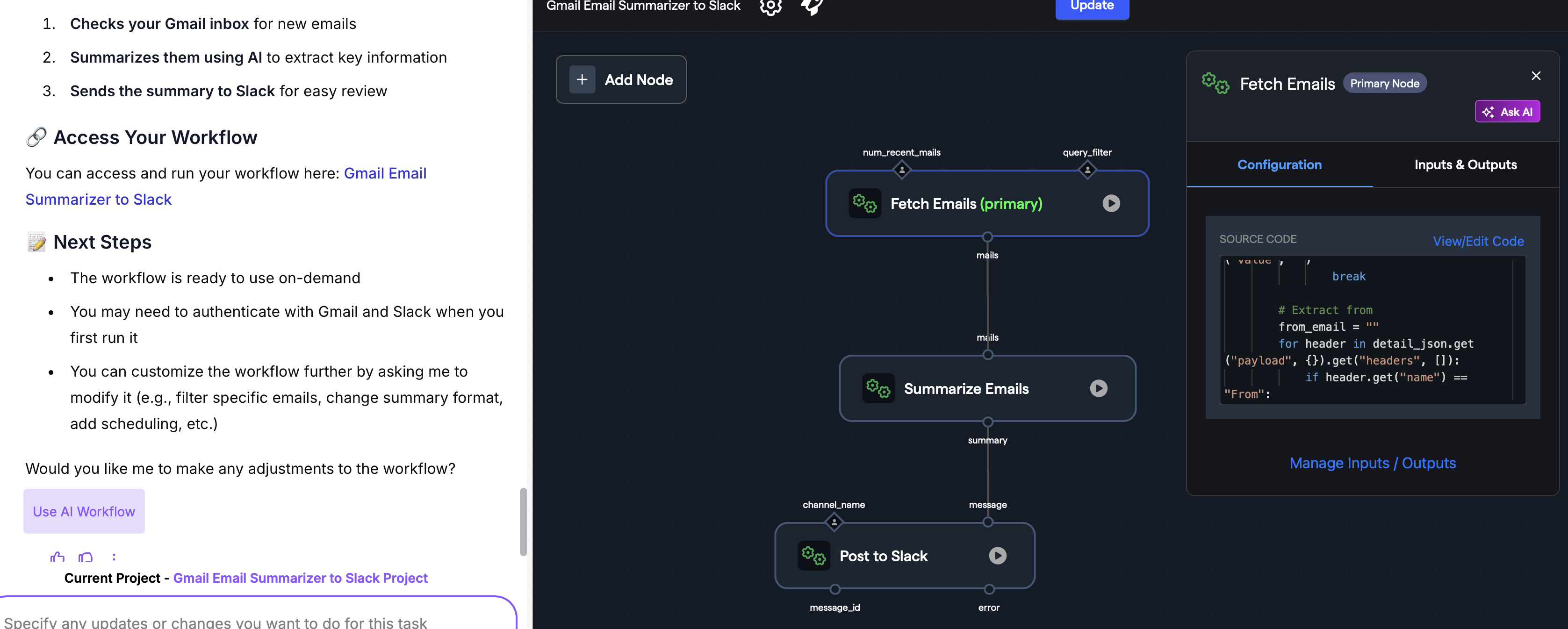 After completion the workflow will be deployed and you'll be able to test it and make any additonal changes you need to all within the same conversation.
