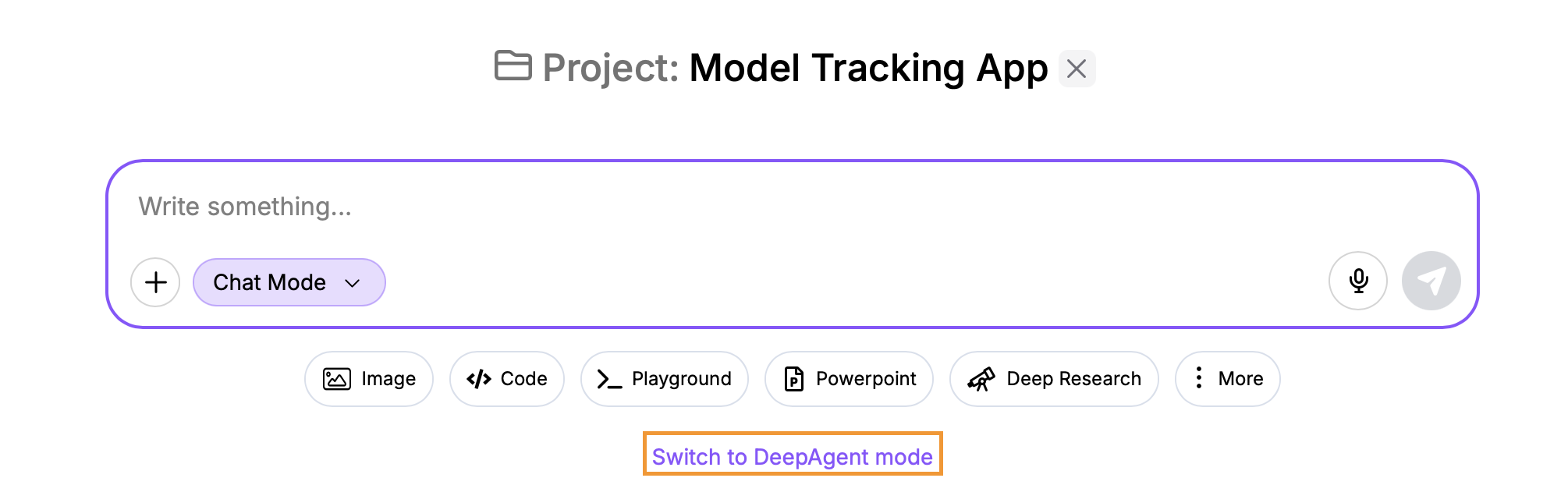 It is now possible to include DeepAgent conversations inside of projects, making it much easier to work collaboratively on DeepAgent tasks. To start a new DeepAgent conversation inside an existing project, using the Switch to DeepAgent mode button: