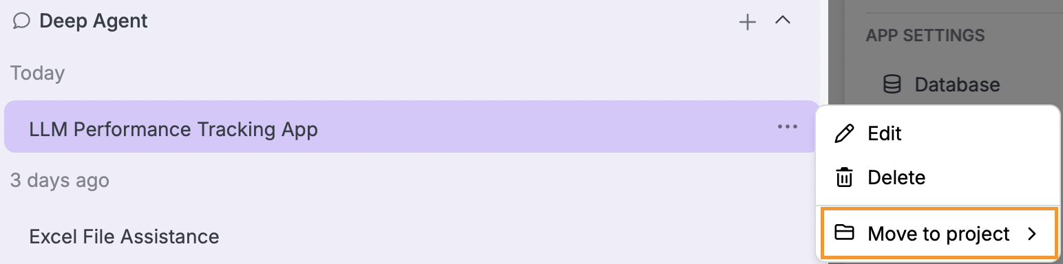 Click on the ... next to a DeepAgent conversation and then use the menu to select Move to project