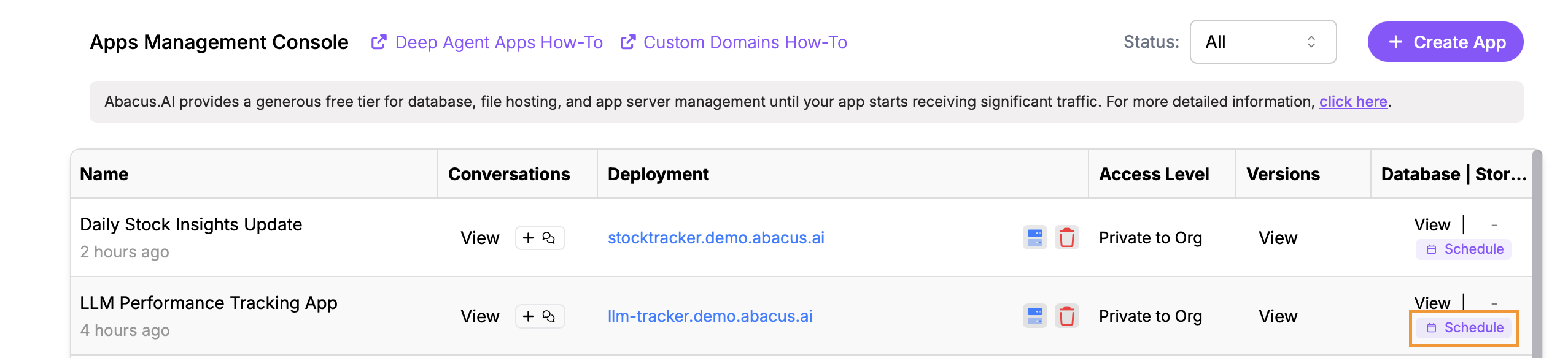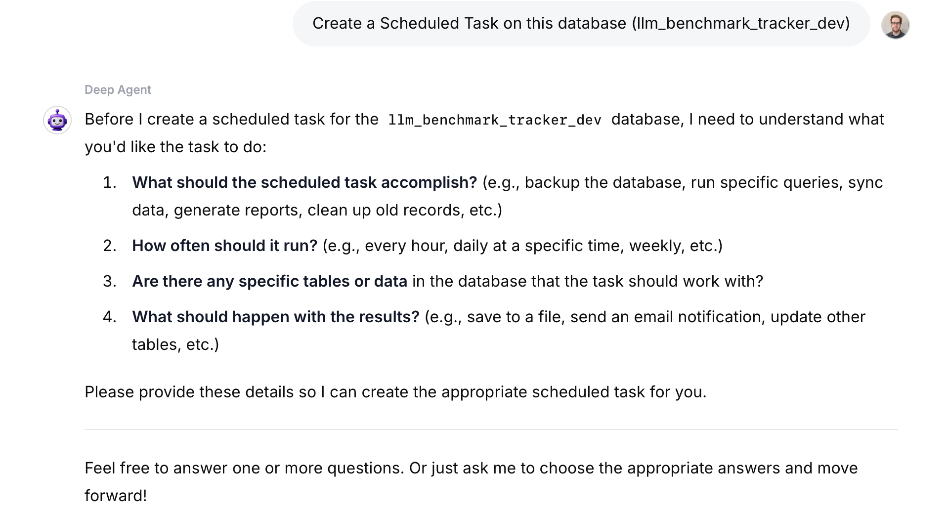 Clicking on the schedule button will open up a new conversation with DeepAgent to specify exactly what the refresh process should be. When complete the DeepAgent will create a Task that can be managed through the Tasks Management Console