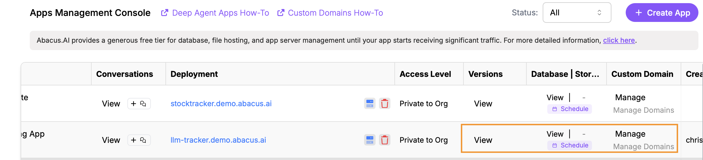 • Through the App Management Console by clicking to View Versions or Database, or by clicking Manage under Custom Domain.
