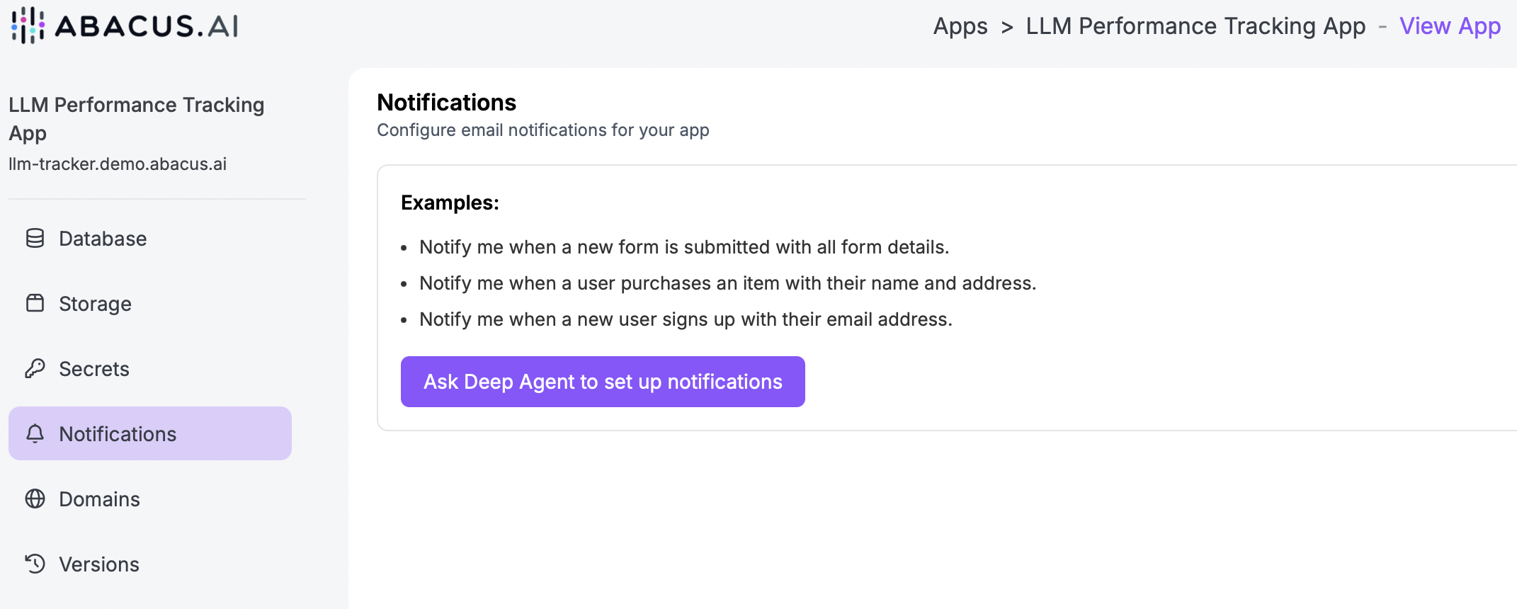 You can use DeepAgent to create notifications for your deployed apps. These notifications can cover a range of things e.g. new users, completed forms, updated data. In order to access notifications you need to navigate to the app settings, which can be done in one of two ways: