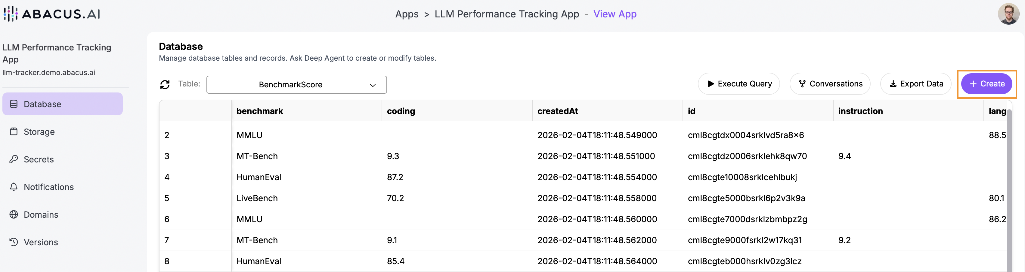 Another new option for DeepAgent apps is the ability to build multiple apps that leverage the same underlying database. This allows for much more efficient data management by preventing the need to host multiple copies of the same data. To do this navigate to the Settings page of the app that has the database you would like to re-use. On the Database tab click on the Create button in the top-right hand corner.