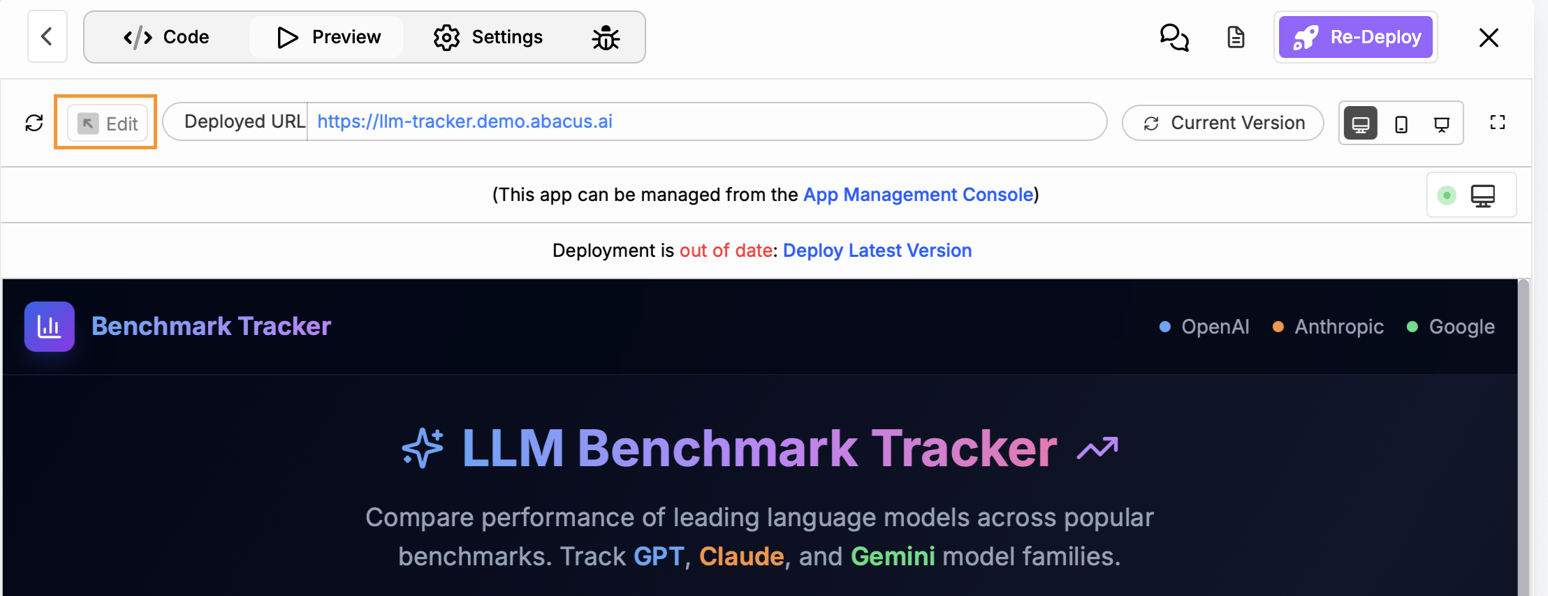 We have added a new Edit function for DeepAgent projects when building either apps or slides. One of the biggest challenges with these projects is that they often require edits and changes after the inital version has been built. Traditionally it is hard for the agent to pinpoint the exact context from the code to make only the relevant changes requested. The Edit feature solves this by providing an inline selection tool that allows you to pinpoint the exact changes you require. The precise context for that element is then passed to the agent making changes much more accurate and efficient.