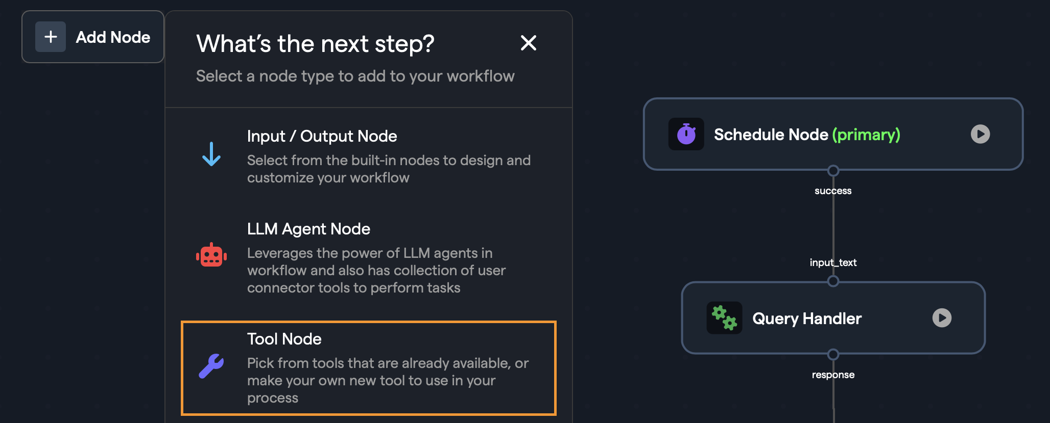 Adding custom tools can be done in the workflow editor. Use the Add Node menu and select Tool Node:
