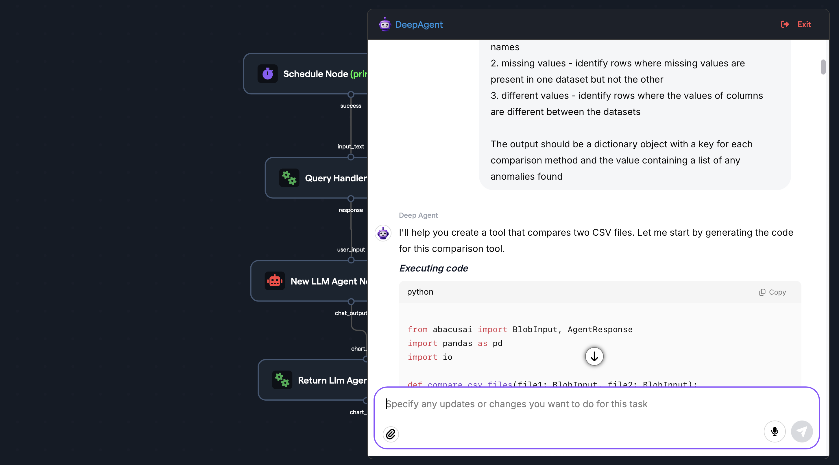A new window will appear inside the workflow editor where the DeepAgent will prompt the user to describe the requirements for the tool, including inputs, outputs and any connectors needed. Once the user has sepcified the tool DeepAgent will build the custom tool: