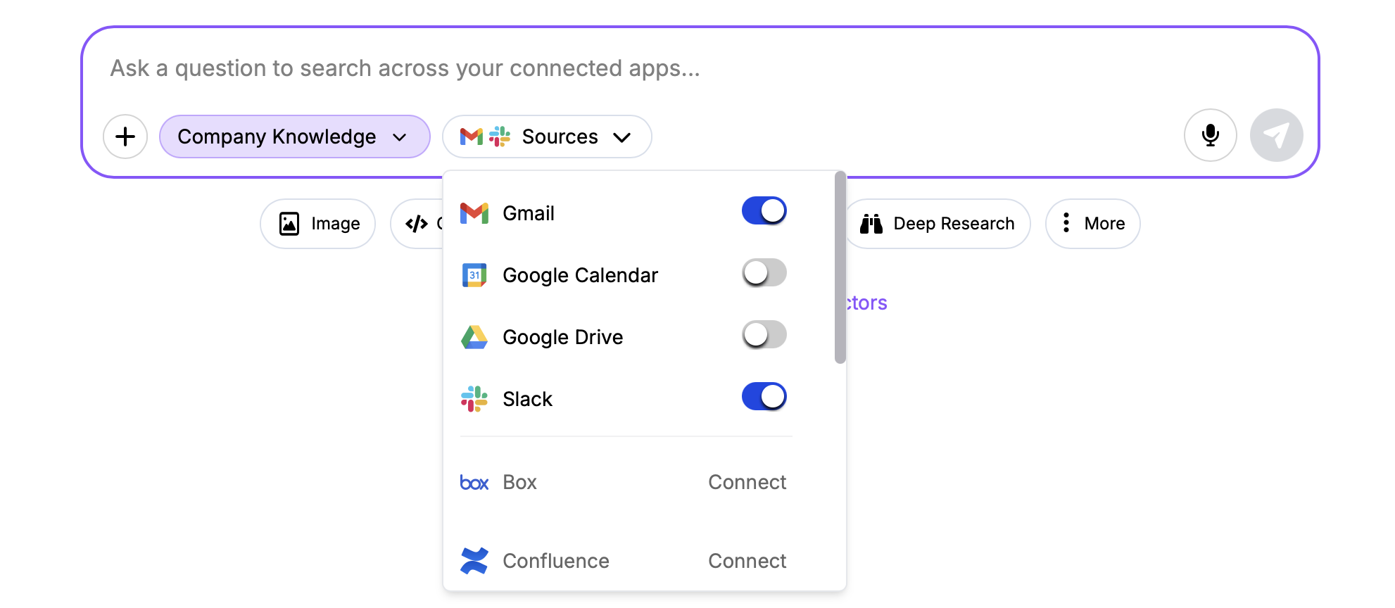 Once selected users can choose which applications to search across for each prompt: