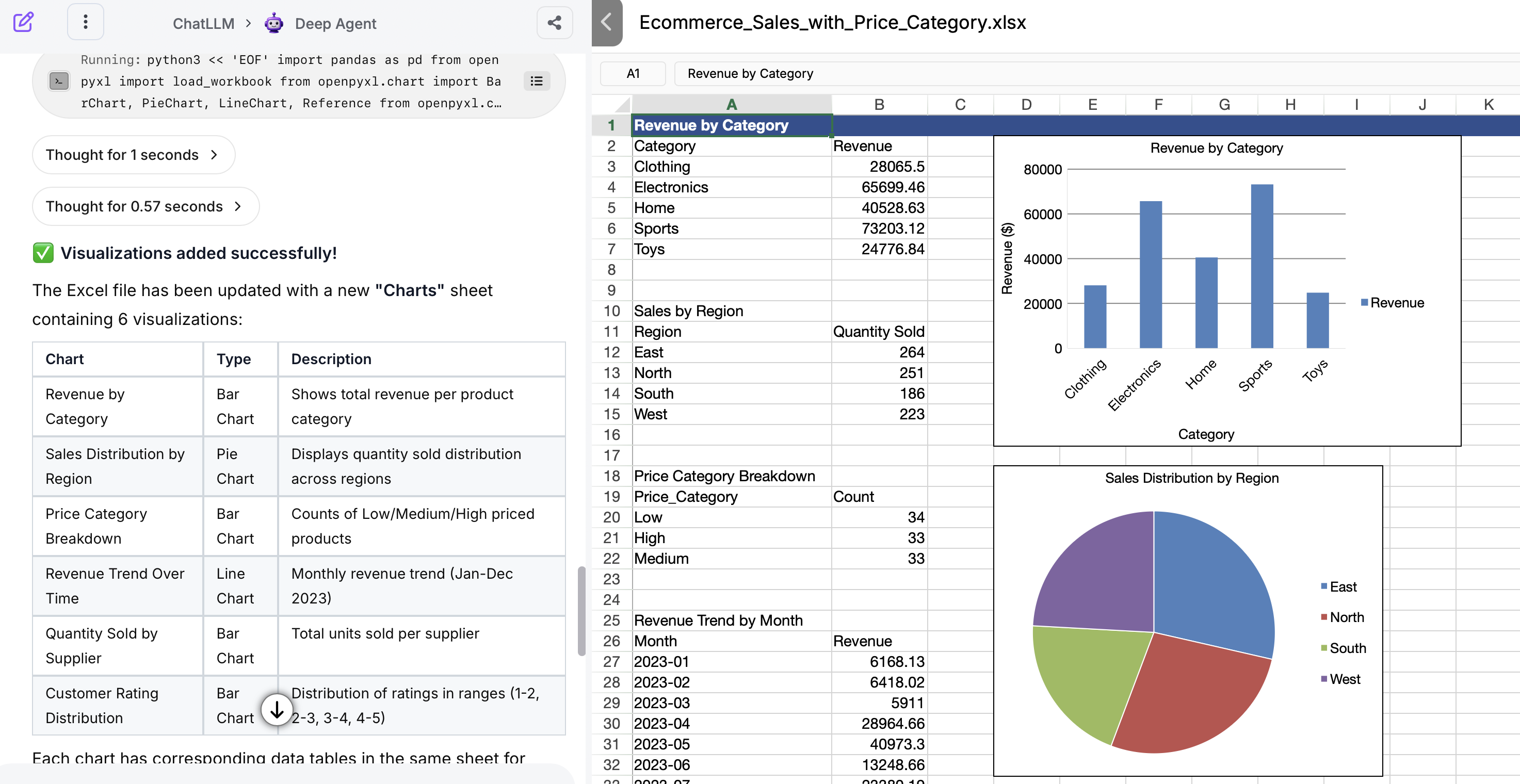 Simply upload your spreadsheet to DeepAgent and prompt the changes you would like to be applied: from adding formulas and calculations to more detailed analysis and visualizations.